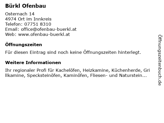 | Öffnungszeiten Bürkl Ofenbau in Ort im Innkreis anzeigen | |