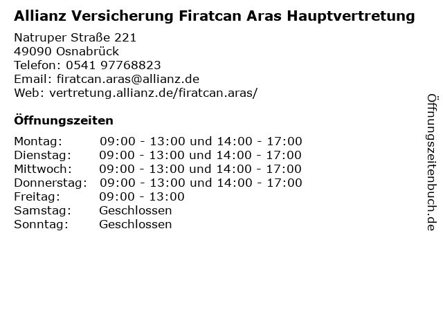 2 Allianz Versicherung Stuntebeck u. Nauber OHG Hauptvertretung (Entfernung: 3,30 km) Schloßwall 28, 49080 Osnabrück 3 Allianz Versicherung Kai Restemeyer Hauptvertretung (Entfernung: 7,59 km) Wasserwerkstraße 17, 49086 Osnabrück 4 AXA Versicherung - Hauptvertretung Matthias Behre (Entfernung: 7,77 km) Mindener Str. 300, 49086 Osnabrück 6 AXA Versicherung - Hauptvertretung Jens Luttmann (Entfernung: 10,89 km) Osnabrücker Str. 7, 49170 Hagen |