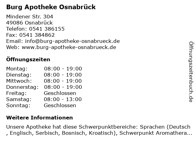| Öffnungszeiten Burg Apotheke Osnabrück in Osnabrück anzeigen | |