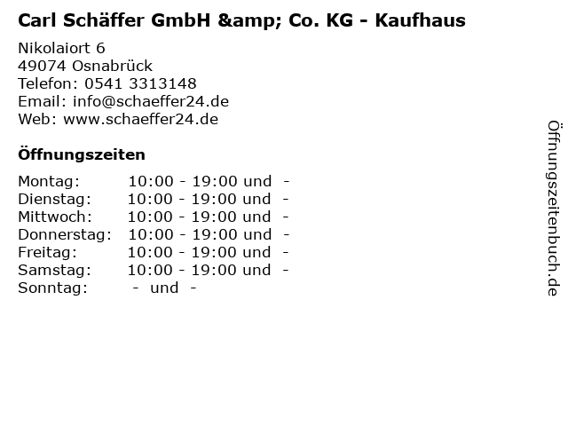 1 Schäffer Porzellan Glas Stoffe Spielwaren Geschenkartikel (Entfernung: 0,00 km) Nikolaiort 6-9, 49074 Osnabrück 6 Sassmann Inhaber Peter Piwko, Carl Unterhaltungscenter (Entfernung: 12,28 km) Alte Poststr. 2 A, 49492 Westerkappeln |