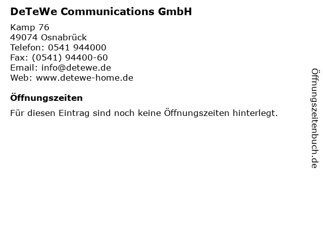 | Öffnungszeiten DeTeWe Communications GmbH in Osnabrück anzeigen | |