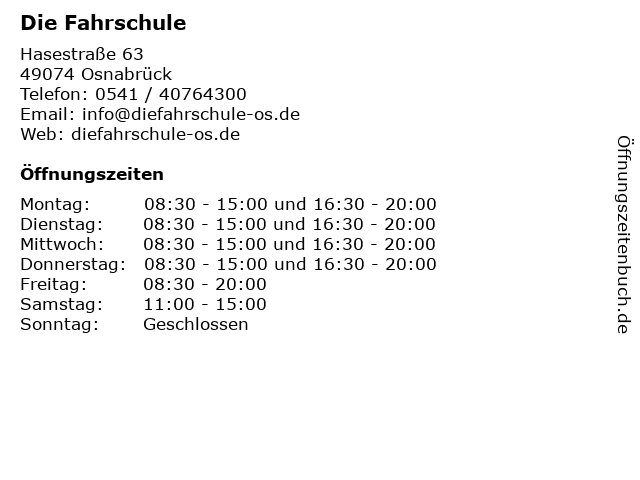 | Öffnungszeiten Die Fahrschule in Osnabrück anzeigen | |