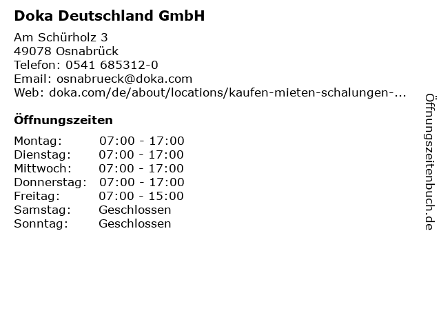 | Öffnungszeiten Doka Deutschland GmbH in Osnabrück anzeigen | |