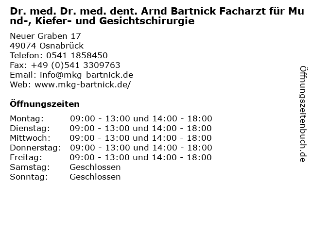 2 Dr. Dr. Albert Osterhaus - Mund-, Gesichts- und Kieferchirurgie (Entfernung: 0,35 km) Kollegienwall 3-4, 49074 Osnabrück 3 Dr. Dr. Axel Heidemeyer Facharzt für Mund- Kiefer- und Gesichtschirurgie (Entfernung: 0,35 km) Kollegienwall 3-4, 49074 Osnabrück 4 Zahnmedizin im Zentrum - Dr. med. dent. Marc Lamek & Collegen (Entfernung: 0,44 km) Rehmstr. 1a, 49080 Osnabrück 5 Blase Rolf Dr. med. dent. MSc. u. Pfaff Volker, Dr. med. dent. MSc. (Entfernung: 0,47 km) Krahnstr. 32-33, 49074 Osnabrück 6 Dr. med. dent. Christel Duvendack Zahnärztin (Entfernung: 0,58 km) Johannisstraße 19 -20, 49074 Osnabrück |