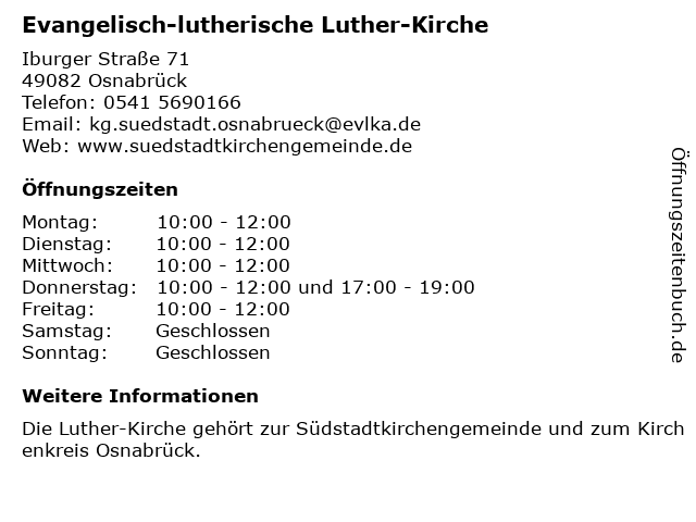 1 Kindertagesstätte Luther Südstadtkirchengemeinde (Entfernung: 0,13 km) Miquelstr. 15, 49082 Osnabrück 2 Kirche Jesu Christi der Heiligen der letzten Tage (Entfernung: 0,42 km) Siebensternstr. 65, 49082 Osnabrück 3 Evangelisch-lutherische St.-Katharinen-Kirche (Entfernung: 1,70 km) An Der Katharinenkirche 8, 49074 Osnabrück 4 Evangelisch-lutherische St.-Marien-Kirche (Entfernung: 2,19 km) An Der Marienkirche , 49074 Osnabrück 6 |