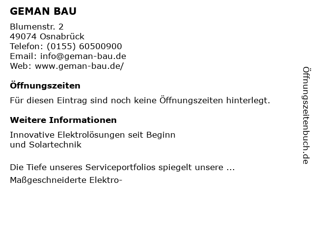 | Öffnungszeiten GEMAN BAU in Osnabrück anzeigen | |