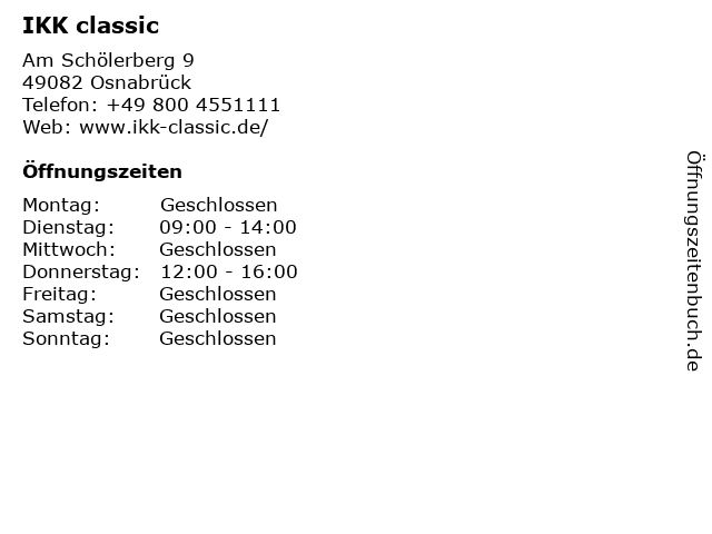 | Öffnungszeiten IKK classic in Osnabrück anzeigen | |