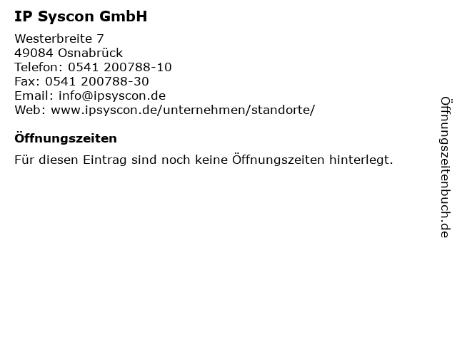 | Öffnungszeiten IP Syscon GmbH in Osnabrück anzeigen | |