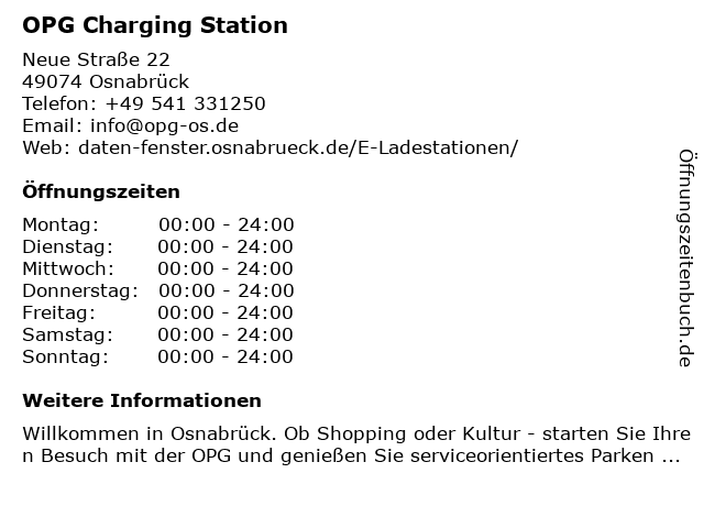 | Öffnungszeiten OPG Charging Station in Osnabrück anzeigen | |