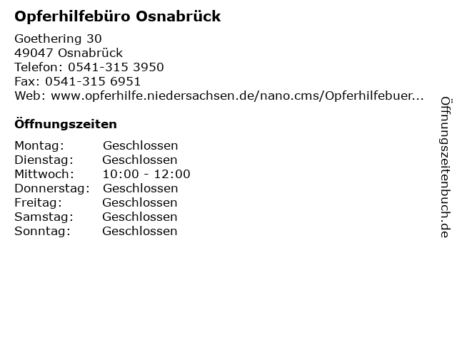 | Öffnungszeiten Opferhilfebüro Osnabrück in Osnabrück anzeigen | |