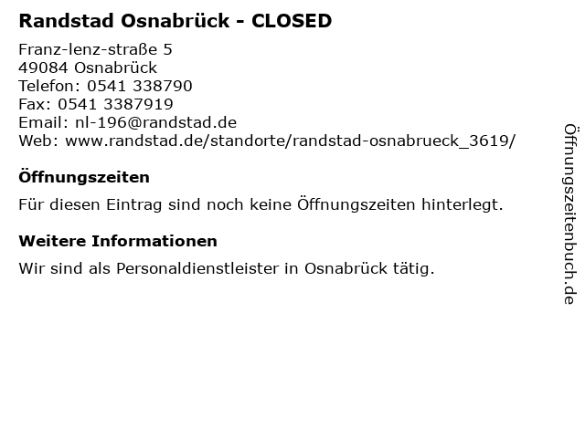 | Öffnungszeiten Randstad Osnabrück - CLOSED in Osnabrück anzeigen | |