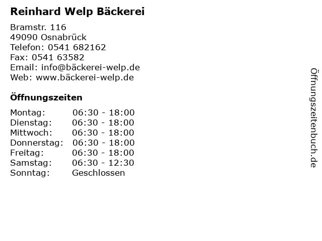 | Öffnungszeiten Reinhard Welp Bäckerei in Osnabrück anzeigen | |