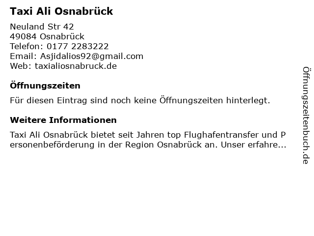 | Telefonnummer Taxi Ali Osnabrück in Osnabrück (0177 2283222) anrufen | |