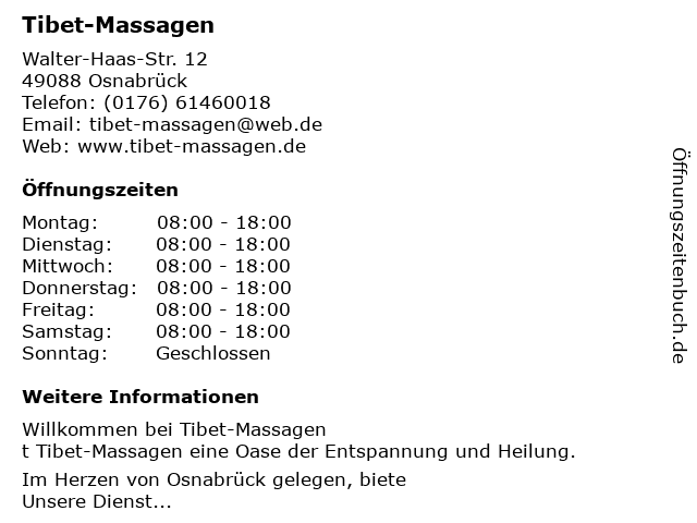 | Öffnungszeiten Tibet-Massagen in Osnabrück anzeigen | |