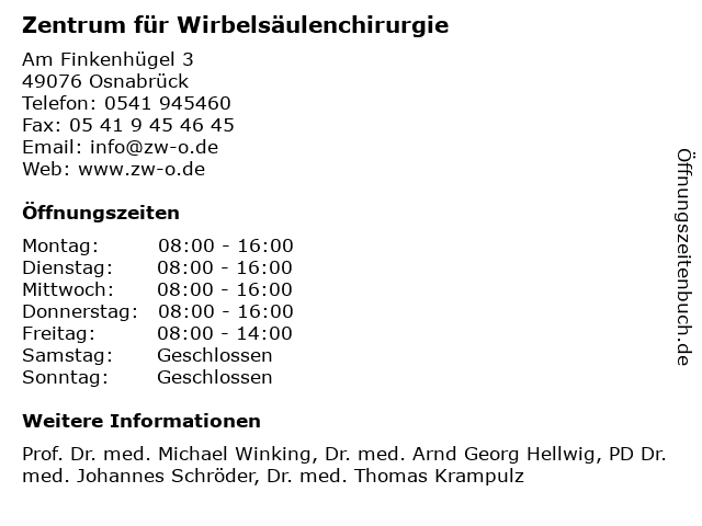 1 Klinikum Ibbenbüren, Wirbelsäulenchirurgie/Wirbelsäulenzentrum (Entfernung: 19,87 km) Weststr. 9, 49477 Ibbenbüren 2 Dr. E. Thiele, Dr. M. Ollefs & O. Konrad - Kinderarzt-Praxis (Entfernung: 1,17 km) Augustenburger Str. 107, 49078 Osnabrück 3 Dr. Mohammad Abadei Zahnarzt f.Kieferorthopädie (Entfernung: 1,20 km) Lotter Str. 75, 49078 Osnabrück 4 Dr. med. T. Belickin Facharzt f. Neurochirurgie (Entfernung: 1,56 km) Am Natruper Holz 44, 49090 Osnabrück 5 Dr. med. Stephan Burgard Facharzt für Innere Medizin • Diabetologe DDG • Ernährungsmedizin Dr. med. Christiane Ekenhorst Fachärztin für Allgemeinmedizin und Innere Medizin Start Praxis Leistungen» Tea (Entfernung: 2,26 km) Kleine Schulstraße 6, 49078 Osnabrück 6 |