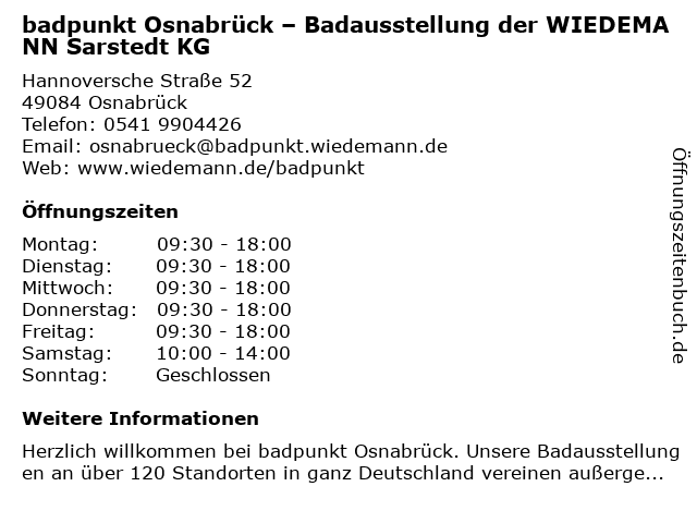 2 badpunkt Badaustellung - Kurt Pietsch GmbH & Co. KG (Entfernung: 0,74 km) Grosshandelsring 2, 49084 Osnabrück 3 badpunkt Badausstellung Osnabrück - Elmer (Entfernung: 4,91 km) An Der Blankenburg 43, 49078 Osnabrück 5 Elting GmbH - Fachgroßhandel Haustechnik - Badausstellung (Entfernung: 35,50 km) Hansaring 148, 48268 Greven 6  |