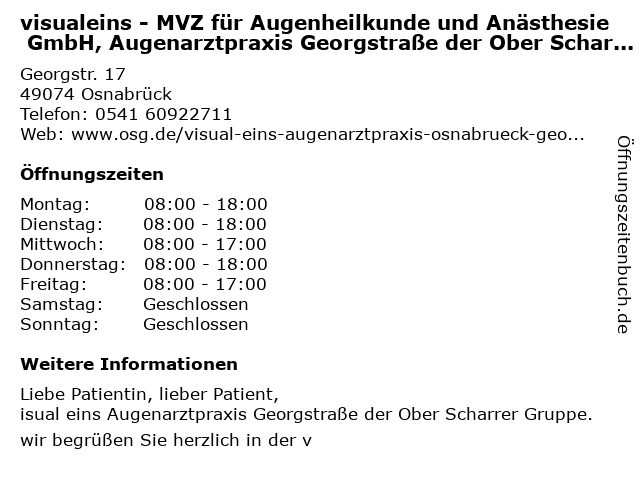 Branchen & Suchbegriffe zu visualeins - MVZ für Augenheilkunde und Anästhesie GmbH, Augenarztpraxis Georgstraße der Ober Scharrer Gruppe:anästhesie, augenarztpraxis, augenheilkunde, georgstraße, gruppe, mvz, ober, scharrer, visualeins |