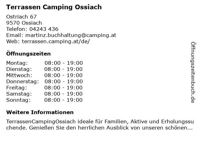 | Öffnungszeiten Terrassen Camping Ossiach in Ossiach anzeigen | |