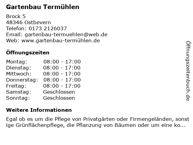 | Öffnungszeiten Gartenbau Termühlen in Ostbevern anzeigen | |