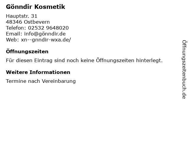 | Öffnungszeiten Gönndir Kosmetik in Ostbevern anzeigen | |