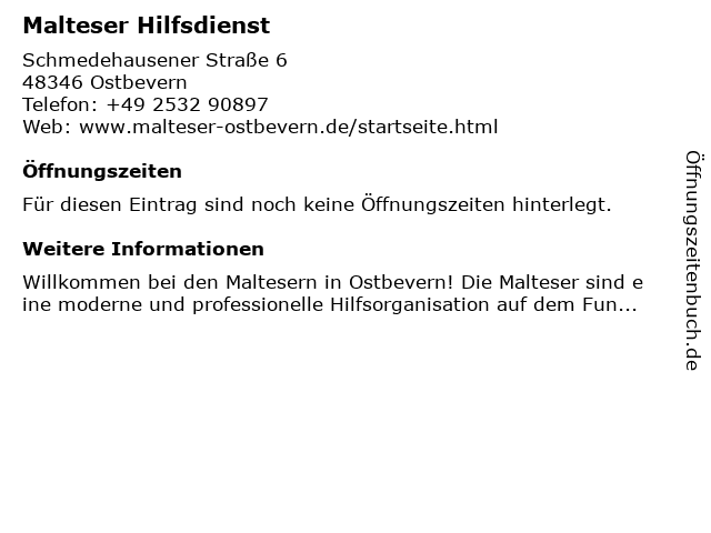 | Öffnungszeiten Malteser Hilfsdienst in Ostbevern anzeigen | |
