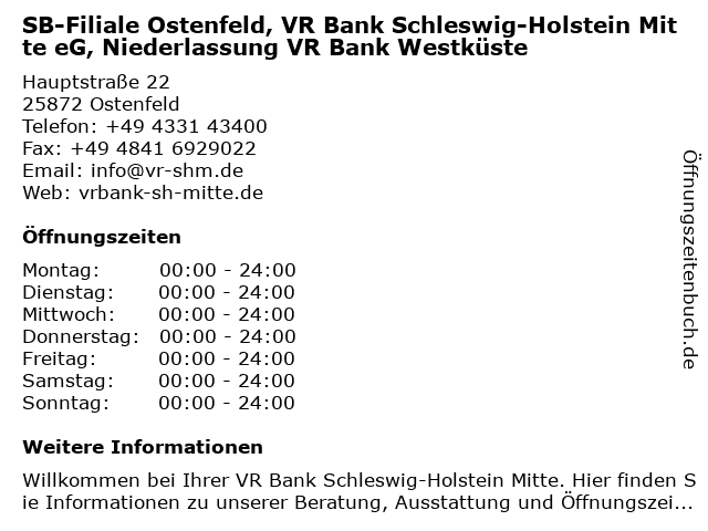 Branchen & Suchbegriffe zu SB-Filiale Ostenfeld, VR Bank Schleswig-Holstein Mitte eG, Niederlassung VR Bank Westküste:bank, eg, holstein, mitte, niederlassung, ostenfeld, sb, vr, westküste |