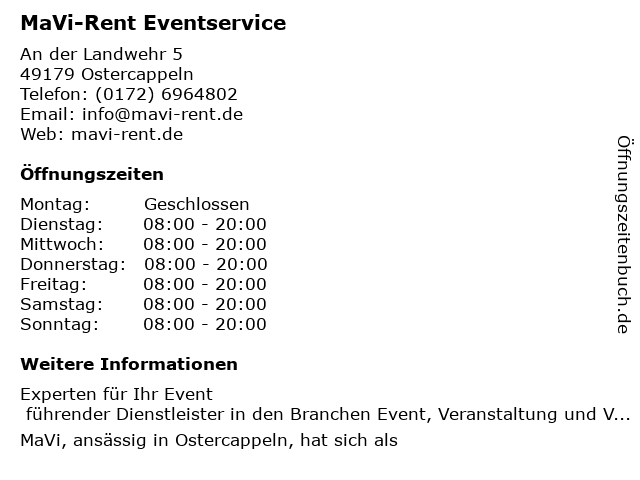 | Öffnungszeiten MaVi-Rent Eventservice in Ostercappeln anzeigen | |