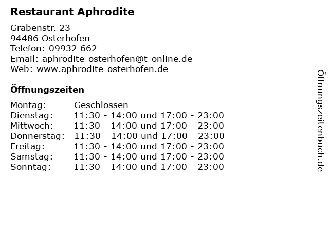| Öffnungszeiten Restaurant Aphrodite in Osterhofen anzeigen | |