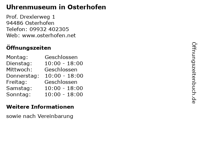 | Öffnungszeiten Uhrenmuseum in Osterhofen in Osterhofen anzeigen | |