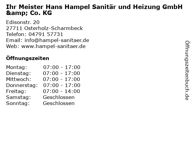 2 Hans Hampel Ltd. & Co. KG Heizungs- und Sanitärbaumeister (Entfernung: 1,94 km) Sandhausener Ring 3, 27711 Osterholz-Scharmbeck 6 |
