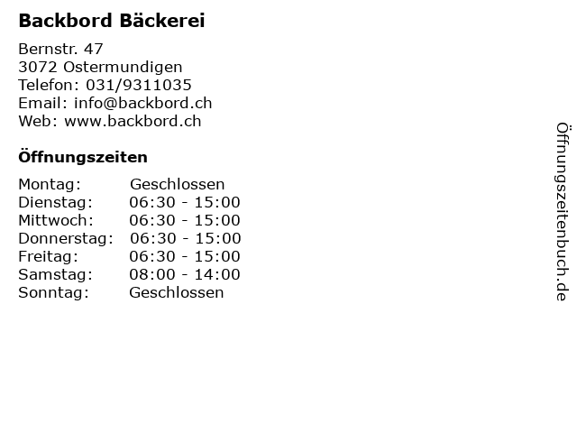 | Öffnungszeiten Backbord Bäckerei in Ostermundigen anzeigen | |