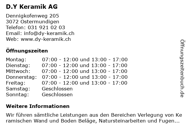 | Öffnungszeiten D.Y Keramik AG in Ostermundigen anzeigen | |