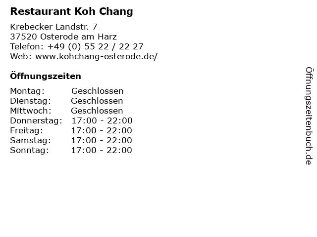 1 Restaurant Koh Chang Thailändische Restaurant (Entfernung: 1,14 km) Langer Krummer Bruch 24, 37520 Osterode 6 |