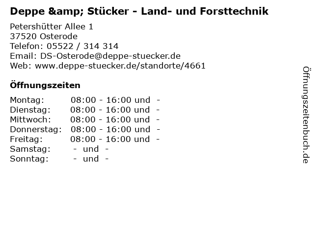 1 Deppe & Stücker - Land- und Forsttechnik (Entfernung: 18,85 km) Barbiser Str. 134, 37431 Bad Lauterberg 2 ALOHA Aqua-Land Osterode am Harz (Wellnesszeiten) (Entfernung: 0,96 km) Schwimmbadstraße 1, 37520 Osterode am Harz 3 ALOHA Aqua-Land Osterode am Harz (Hallenbad) (Entfernung: 0,96 km) Schwimmbadstraße 1, 37520 Osterode am Harz 4 ALOHA Aqua-Land Osterode am Harz (Freibad - Außerhalb der Ferien) (Entfernung: 0,96 km) Schwimmbadstraße 1, 37520 Osterode am Harz 5 ALOHA Aqua-Land Osterode am Harz (Freibad - Ferienzeit) (Entfernung: 0,96 km) Schwimmbadstraße 1, 37520 Osterode am Harz 6 Ev.-luth. Kirchenkreis Harzer Land Kirchenkreisamt (Entfernung: 1,27 km) Schloßplatz 3a, 37520 Osterode |