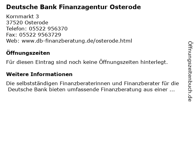 | Deutsche Bank Finanzagentur Osterode anrufen | |