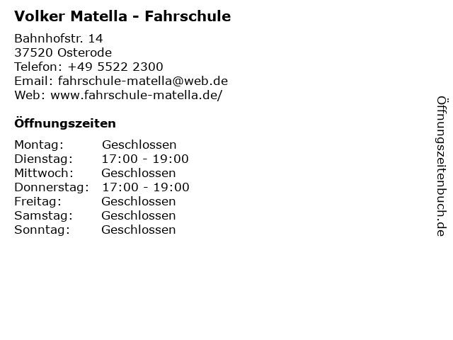 | Öffnungszeiten Volker Matella - Fahrschule in Osterode anzeigen | |
