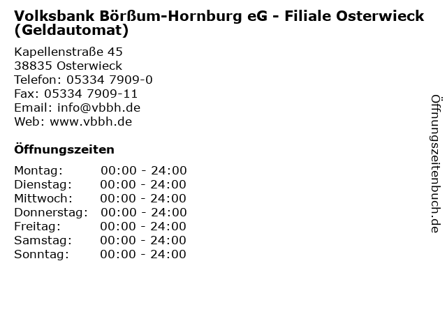 1 Volksbank Börßum-Hornburg eG - Filiale Osterwieck (Entfernung: 0,00 km) Kapellenstraße 45, 38835 Osterwieck 2 Volksbank Börßum-Hornburg eG - Filiale Hornburg (Entfernung: 9,97 km) Vor dem Dammtor 2a, 38315 Hornburg 3 Volksbank Börßum-Hornburg eG - Filiale Hornburg (Geldautomat) (Entfernung: 9,97 km) Vor dem Dammtor 2a, 38315 Hornburg 5 Volksbank Börßum-Hornburg eG (Geldautomat) (Entfernung: 13,99 km) An der alten Mühle 1, 38327 Semmenstedt 6 Volksbank Börßum-Hornburg eG - Hauptstelle Börßum (Geldautomat) (Entfernung: 14,10 km) Hauptstraße 82, 38312 Börßum |