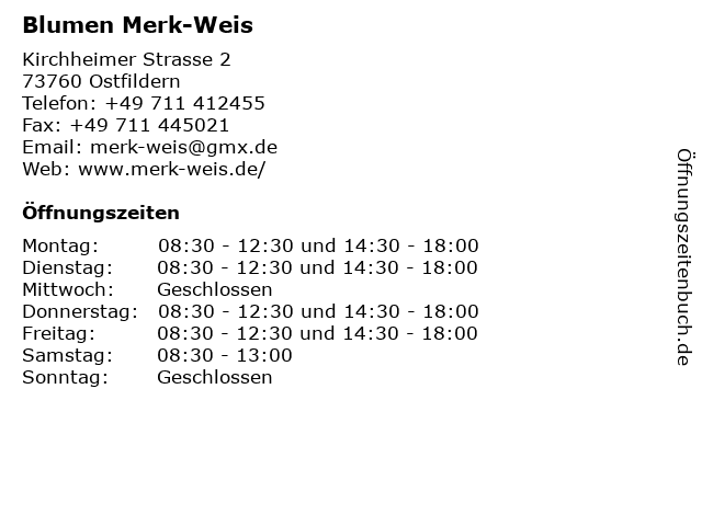 | Öffnungszeiten Blumen Merk-Weis in Ostfildern anzeigen | |