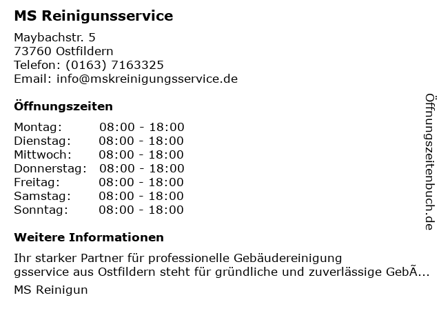 | Öffnungszeiten MS Reinigunsservice in Ostfildern anzeigen | |