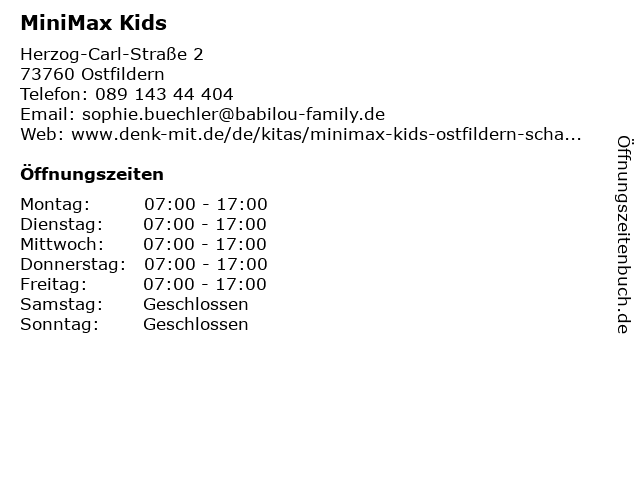 | Öffnungszeiten MiniMax Kids in Ostfildern anzeigen | |