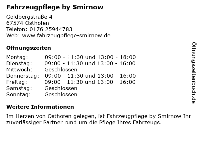 | Öffnungszeiten Fahrzeugpflege by Smirnow in Osthofen anzeigen | |