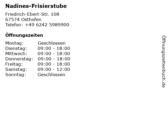 | Öffnungszeiten Nadines-Frisierstube in Osthofen anzeigen | |