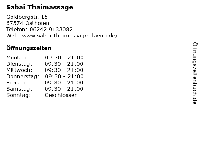 | Öffnungszeiten Sabai Thaimassage in Osthofen anzeigen | |