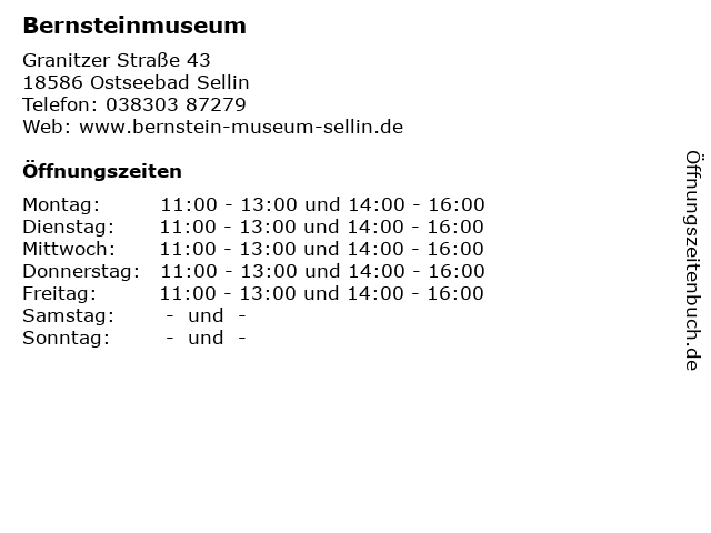 | Öffnungszeiten Bernsteinmuseum in Ostseebad Sellin anzeigen | |
