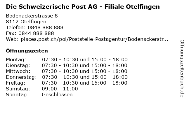 Branchen & Suchbegriffe zu Die Schweizerische Post AG - Filiale Otelfingen:bareinzahlungen, bargeldbezug, briefe, briefmarke, einzahlungen, empfangen, otelfingen, pakete, post, schweizerische, versenden, zahlungsverkehr |
