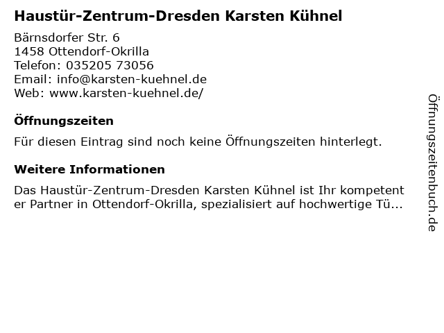 1 Haustür-Zentrum-Dresden Karsten Kühnel (Entfernung: 0,00 km) Bärnsdorfer Str. 6, 01458 Ottendorf-Okrilla 6 |