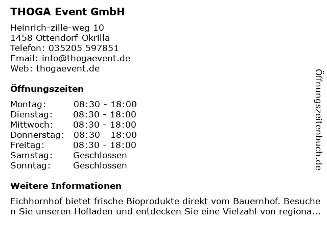 | Öffnungszeiten THOGA Event GmbH in Ottendorf-Okrilla anzeigen | |