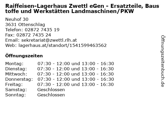 1 Raiffeisen Lagerhaus Ottenschlag - Genol Tankstelle (Entfernung: 0,00 km) Neuhof 30, 3631 Ottenschlag 2 Raiffeisen-Lagerhaus Zwettl eGen - Agrar, Brennstoffe & Holzeinkauf (Entfernung: 0,01 km) Neuhof 30, 3631 Ottenschlag 3 Raiffeisen-Lagerhaus Zwettl eGen - Landmaschinenhandel (Entfernung: 0,01 km) Neuhof 30, 3631 Ottenschlag 4 Raiffeisen-Lagerhaus Zwettl eGen - Ersatzteile, Werkstätte Landmaschinen und Werkstätte PKW (Entfernung: 5,35 km) Schulstraße 20/1, 3623 Kottes 5 Raiffeisen-Lagerhaus Zwettl eGen - Agrar, Bau & Garten, Baustoffe und Brennstoffe (Entfernung: 5,35 km) Schulstraße 20/1, 3623 Kottes 6 |