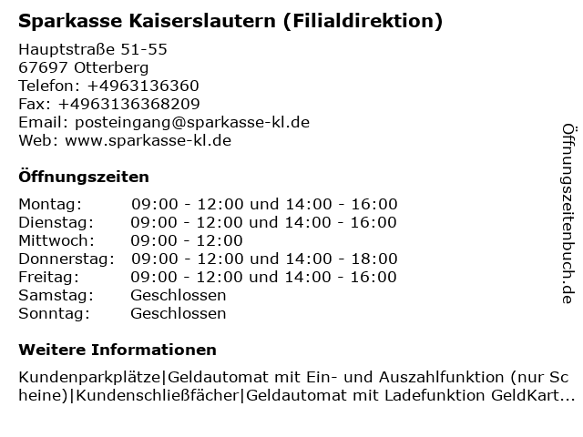 1 Sparkasse Kaiserslautern (BeratungsCenter) (Entfernung: 6,42 km) Stiftsplatz 10, 67655 Kaiserslautern 2 3 Sparkasse Kaiserslautern (BeratungsCenter) (Entfernung: 9,28 km) Hauptstraße 16, 67677 Enkenbach-Alsenborn 5 Sparkasse Kaiserslautern (BeratungsCenter) (Entfernung: 16,87 km) Landstuhler Straße 6, 66877 Ramstein-Miesenbach 6 |