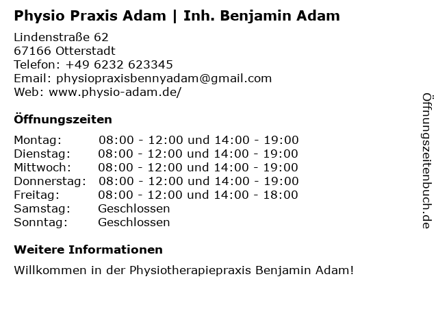Branchen & Suchbegriffe zu Physio Praxis Adam | Inh. Benjamin Adam:adam, benjamin, elektrotherapie, kiefergelenktherapie, krankengymnastik, lymphdrainage, manuelle therapie, massage, physio, physiotherapie, praxis, sektoraler heilpraktiker, sportosteopathen, sportphysiotherapie |